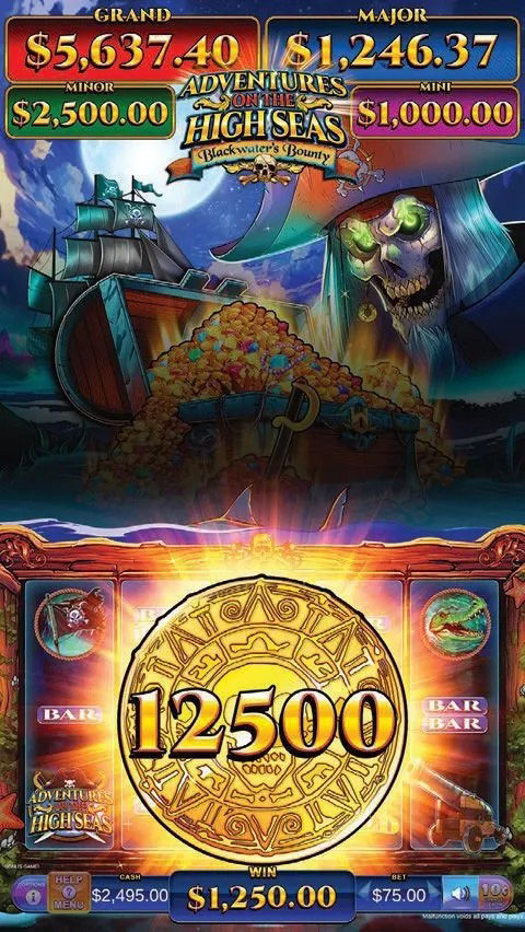 There are two main bonus features. During the primary game, a collection pot feature is ongoing. Every time a doubloon lands on the reels, it will fly up to the treasure chest on the top screen. The treasure chest grows as more doubloons fly into it, until it bursts—with a flashy animated explosion—to trigger a jackpot picking bonus.
