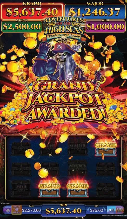 The main game character—Blackwater, who is a skeleton pirate, a la Pirates of the Caribbean; or Rose, a beauty in colorful dress holding a saber and an 18th century flintlock pistol—stands atop the compass as the accumulated award counts off. “To really accentuate the win, we have Rose or Blackwater on top smiling at you,” says Johnston.