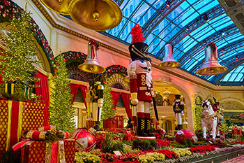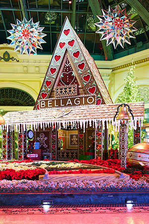 New to the East Bed, The Bellagio Express, inspired by traditional train ornaments, is conducted by Elvie the Elf as the locomotive carries larger-than-life ornaments and gifts. Guests can walk through the train itself, following a whimsical, walkable path that winds through the display for an up-close experience. Billowing clouds of baby’s breath rise from the train’s smokestack and fill the air among red and white crystal snowflakes while decorative trees and vibrant poinsettias grace the bed beneath.
